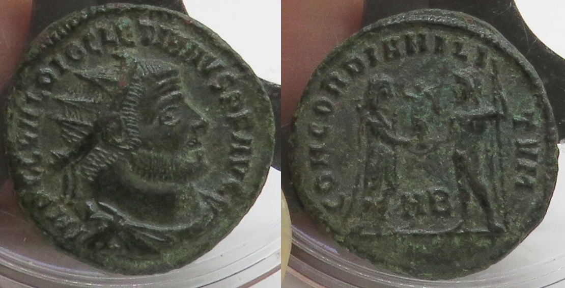Heraclea RIC VI 13,B | Diocletian AE20 Post Reform Radiate. IMP CC VAL DIOCLETIANVS PF AVG., radiate draped bust right / CONCORDIA MILITVM, Diocletian standing right in military dress, holding parazonium, receiving Victory on globe from Jupiter leaning on sceptre, HB in lower centre. RIC VI Heraclea 13/21 (identical); Sear 12636. |