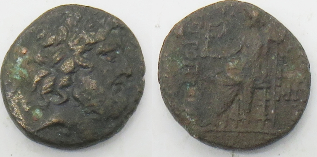 | RPC 4201 cf | Antioch ad Orontem, Syria,. Uncertain date, but during the early Roman period. AE 19 mm (8.00 g). Laureate head of Zeus right / ANTIOXEΩN/THS in two lines right, MHTΡOΠOΛEΩN left, Zeus seated left, holding Nike in outstretched right hand, sceptre in left. |