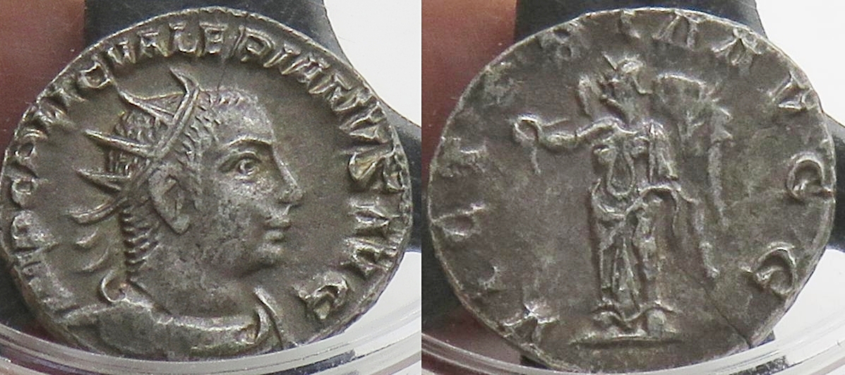 | RIC 125 | Valerian, AR Antoninian, A.D. 254, Rome mint. IMP C P LIC VALERIANVS AVG, radiate draped and cuirassed bust right / VICTORIA AVGG, Victory standing left, holding wreath and palm. RIC 125; C. 230. |