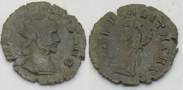 | RIC 57 | Claudius II AE antoninianus. Rome, 268-270 AD. IMP C CLAVDIVS AVG, radiate, cuirassed bust right / LIBERALITAS AVG, Liberalitas standing left, holding coin counter and cornucopiae. Cohen 144; Sear5 11348. |