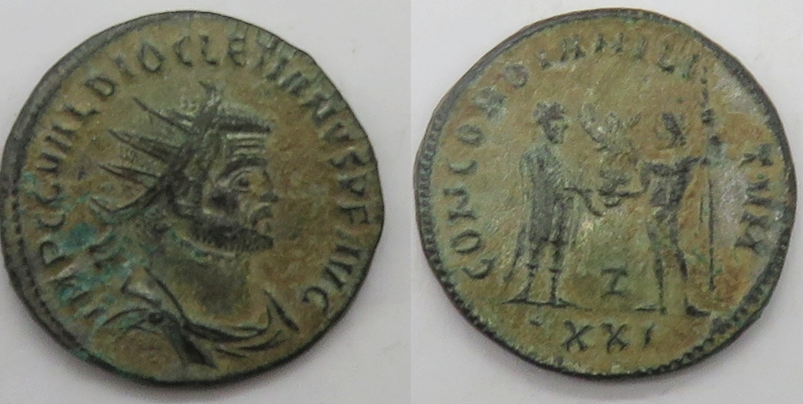 | RIC 306, Γ | Diocletian AE Antoninianus. Cyzicus mint. IMP CC VAL DIOCLETIANVS AVG, radiate and draped bust right / CONCORDIA MILITVM dot, Emperor standing right, holding parazonium, receiving Victory from Jupiter standing left, holding sceptre, officina letter Γ in lower centre. Mintmark XXI dot. Cohen 33; RIC V-2 306; Sear 12635. |