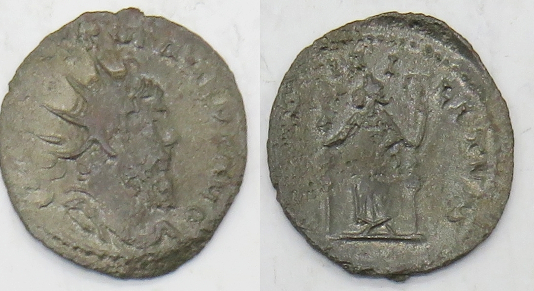 | RIC 59 | Postumus AR Antoninianus. Cologne mint. IMP C POSTVMVS P F AVG, radiate, draped and cuirassed bust right / FIDES MILITVM, Fides standing left holding two standards. RIC 59 ("Lyons")Cohen 67, Sear 10940. |