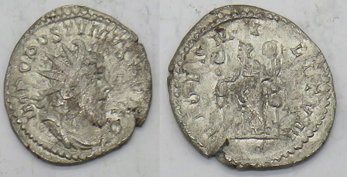 | RIC 59 | Postumus AR Antoninianus. Cologne mint. IMP C POSTVMVS P F AVG, radiate, draped and cuirassed bust right / FIDES MILITVM, Fides standing left holding two standards. RIC 59 ("Lyons")Cohen 67, Sear 10940. |