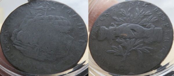 HALFPENNY 1793 ao redor, o topo do caduceu aponta para o centro do R de COMMERCIAL , a parte inferior do caduceu aponta para o stop depois de HALFPENNY , data de fechamento, quadrado 1 , rev duas mãos unidas, em frente a um ramo de oliveira, ARTE FAVENTE NIL DESPERANDUM ao redor, letras pequenas na inscrição, as folhas superiores mais internas do ramo de oliveira apontam para o primeiro ramo do N e à esquerda da base do I do NIL , borda A PAGAR EM LEEK STAFFORDSHIRE