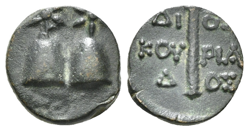 COLCHIS. Dioscurias. Time of Mithradates VI Eupator (Circa 105-90 BC). Ae. Obv: Piloi of the dioskouroi surmounted by stars. Rev: ΔΙ - ΟΣ / ΚΟV - ΡΙΑ / Δ - ΟΣ. Legend in three lines around thyrsos. 4,00 g
