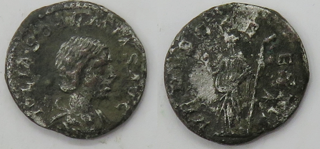 | RIC 241 Sear 7719 | Julia Soaemias Denarius. 220-222 AD. IVLIA SOAEMIAS AVG, draped bust right / VENVS CAELESTIS, Venus standing half-left, holding apple and sceptre, star in lower left field. RIC 241; Sear 7719; RSC 8a. |