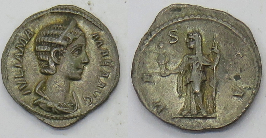 | RIC 360 Sear 8217 | Julia Mamaea Denarius. IVLIA MAMAEA AVG, diademed and draped bust right / VESTA, Vesta standing half-left, holding palladium and sceptre. RSC 81. |