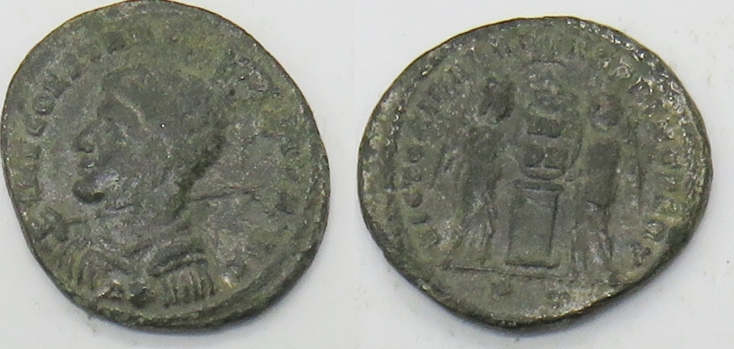 Roman Empire - Constantine I (306-337 A.D.) Æ Silvered Bronze Follis (3.08 g, 19 mm.), Ticinum, 327 AD. IMP CONSTANTINVS AVG, high crested helmeted, cuirassed bust left holding spear over shoulder. VICTORIAE LAETAE PRINC PERP, two Victories holding shield inscribed VOT PR on altar inscribed with a "C". Mintmark PT.