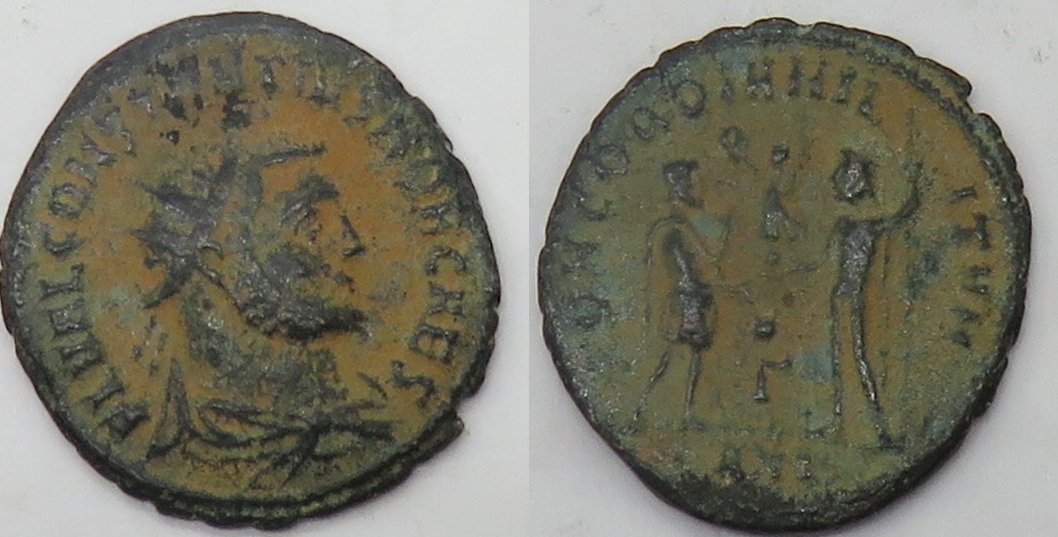 | Antioch RIC VI 61a, Γ | Constantius I AE radiate fraction of Antioch. FL VAL CONSTANTIVS NOB CAES, radiate, draped bust right / CONCORDIA MILITVM, prince standing right in military dress, receiving Victory on globe from Jupiter facing left, leaning on sceptre. Star over Γ in lower centre. Mintmark ANT. RIC VI Antioch 61a. |