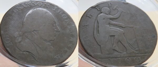 Halfpenny, Striking from the Reverse Die, 1790, obv blank , rev figure of Vulcan seated, HALFPENNY above, 1790 in exergue, Y of HALFPENNY just above the bar, stop just above the top pennant, edge PAYABLE AT MACCLESFIELD LIVERPOOL OR CONGLETON. -. (D&H Warwicks hire unlisted; noted as D&H Warwickshire 430 bis).