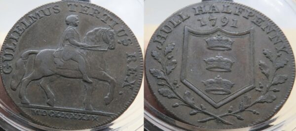 Halfpenny token de 1791 -BRITISH TOKENSYorkshire 20. Casco. Meio centavo de cobre. 12,7 gramas. 29 milímetros. 1791. Estátua de Guilherme III a cavalo; GULIELMUS TERTIUS REX ao redor acima, MDCLXXXIX em exergue / Escudo de armas entre ramos de carvalho; HULL HALFPENNY 1791. BORDA: LONDRES BRISTOL E LIVERPOOL. Escudo de armas; CASCO MEIO PENNY 1791. Borda: PAGÁVEL... IONATHON GARTON...