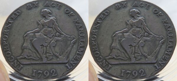 Halfpenny token de 1792 - BRITISH 18TH CENTURY TOKENS, IRLANDA, Hibernian Mine Company, Copper Halfpenny, 1792, figura sentada à esquerda de Hibernia, INCORPORADA POR ATO DO PARLAMENTO 1792, harpa com oito cordas, topo da cabeça sob C de ACT, topo da harpa até o meio de R do PARLAMENTO, O de INCORPORATED baixo, AT de INCORPORATED toque, ED de INCORPORATED toque, segundo A do PARLAMENTO acima de I, 179 inclinado à direita, rev HM Co. cifra, TURNER CAMAC PRESIDENTE HALFPENNY, topo da cifra C aponta para o centro de H de PRESIDENTE, MA de CAMAC toque, C de PRESIDENTE abaixo de H, H de PRESIDENTE abaixo de I, N de PRESIDENTE abaixo do segundo A, primeiro N de HALFPENNY abaixo de E, Y de HALFPENNY se inclina para a esquerda e toca N, borda PAGÁVEL EM DUBLIN OU