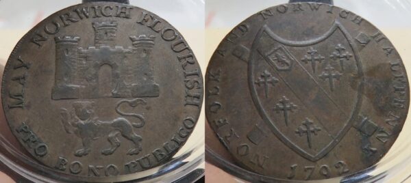 Halfpenny, 1792, armas obv de Norwich, um castelo e um leão abaixo, MAIO NORWICH FLORISH. PRO BONO PUBLICO ao redor, pare depois de FLOURISH, rev escudo de armas do condado de Norfolk, NORFOLK E NORWICH HALFPENNY. 1792 ao redor, a extremidade inferior do bastão à direita se alinha entre os dois N's de HALFPENNY, a extremidade inferior do bastão à esquerda se alinha entre o O e R de NORFOLK, borda PAGÁVEL EM N. BOLINGBROKES HABERDASHER & C. NORWICH. X. (Atkins p.151, 15; D&H Norfolk 14)