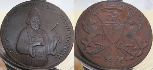 Halfpenny, 1792, obv figura de três quartos do Bispo Blaize segurando um pente, SUCESSO PARA A FABRICAÇÃO DE LÃ. ao redor, pare depois do Y, as pontas do gorro até o segundo O, as dobras do punho da manga esquerda até o batente depois do Y , rev escudo de braços e torcedores, SEMPER FIDELIS na fita, 1792 abaixo, EXETER MEIA PENNY acima , o E de EXETER está acima do topo da cabeça do pégaso, borda A PAGAR NO ARMAZÉM DE SAMUEL KINDON. X. (D&H Devonshire 3a)