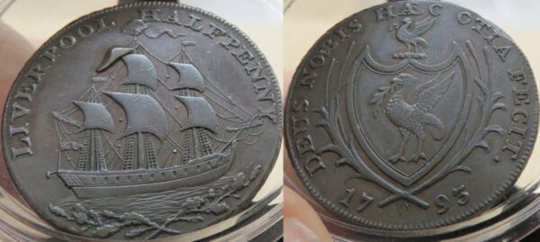 Halfpenny token de 1793 - BRITISH TOKENS OF THE 18TH CENTURYENGLAND LancashireHalf halfpenny 1793. A ship sailing to r. over laurels. LIVERPOOL HALF HALFPENNY Rev.: Shield of arms. DEUS NOBIS HAEC OTIA FECIT 1793 Edge milled. D&H 154.Ef