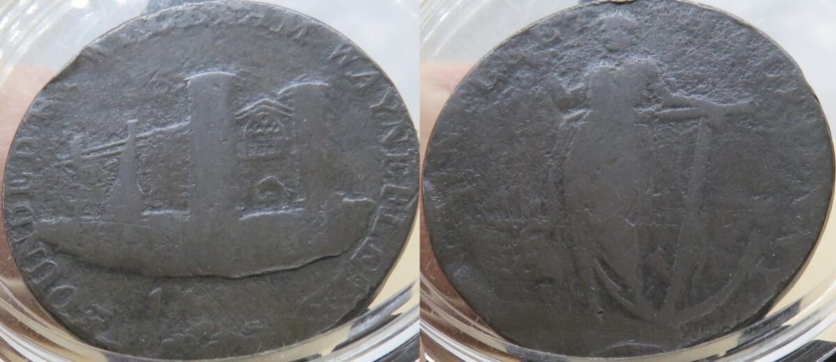 Halfpenny token de 1793 - BRITISH TOKENS OF THE 18TH CENTURYENGLANDLincolnshireWainfleet. Halfpenny 1793. View of Wainfleet Abbey. FOUNDED BY WILLIAM WAYNEFLETE * 1459 Rev.: Hope standing with an anchor, a ship in the distance. WAINFLEET HALFPENNY. 1793. Edge: PAYABLE AT THE WAREHOUSE OF D. WRIGHT & S. PALMER.+. D&H 8.