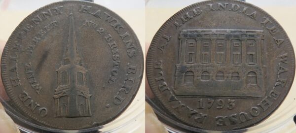 Halfpenny, 1793, torre obv e pináculo de uma igreja, ONE HALFPENNY HAWKINS BIRD. ao redor, rev vista frontal do prédio, data 1793 abaixo, PAGÁVEL NO ARMAZÉM DA ÍNDIA ao redor, borda lisa, não na gola, mas arredondada (Atkins p.177, 76a; D&H Somersetshire 88a).