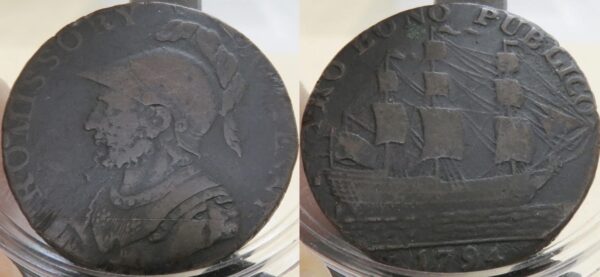 Halfpenny token de 1794 -BRITISH 18th CENTURY TOKENS, John Jordan, Copper Halfpenny, 1794, busto de capacete obv à esquerda, PROMISSORY HALFPENNY ao redor, P de PROMISSORY e a parada depois de HALFPENNY perto do busto, rev navio à vela à direita, 1794 abaixo, PRO BONO PUBLICO acima, o mastro principal entre o O de BONO e o P de PUBLICO, borda PAYABLE AT I & T SHARPS SALISBURY - X - (D&H Hampshire 42, borda não listada; Davisson como D&H Hampshire 42e