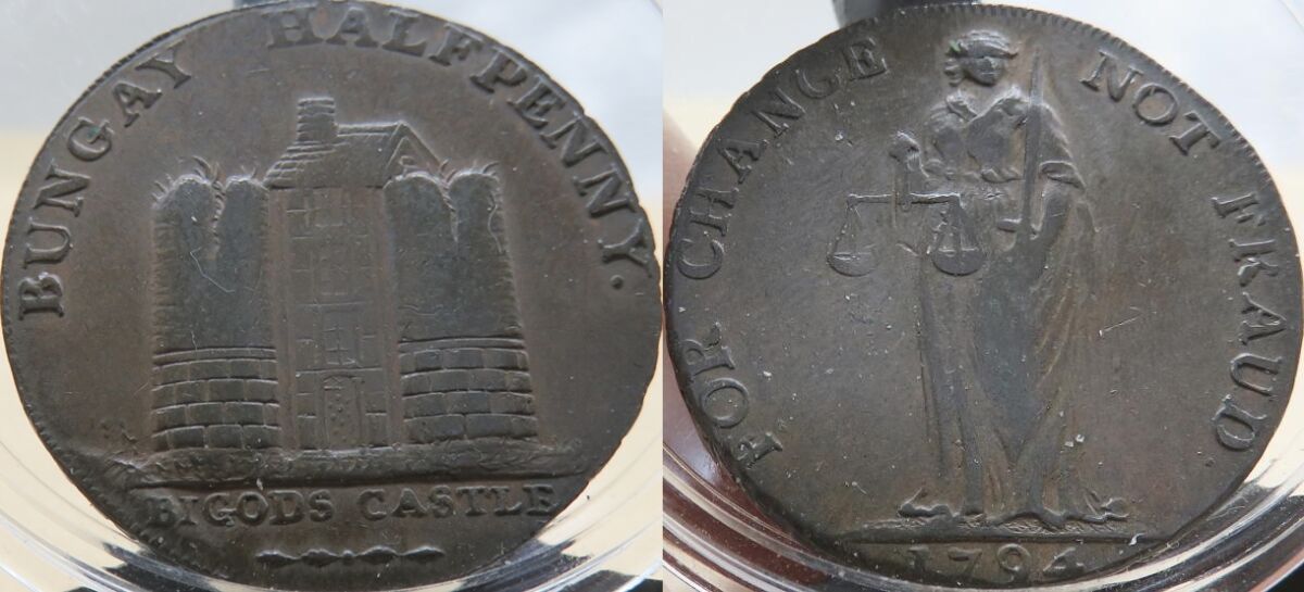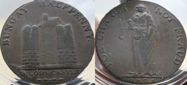 BRITISH 18th CENTURY TOKENS, Samuel Prentice, Copper Halfpenny, 1794, restos obv de uma antiga fortaleza, BUNGAY HALFPENNY ao redor, BIGODS CASTLE em exergue, rev figura da Justiça em pé, FOR CHANGE NOT FRAUD ao redor, 1794 em exergue, borda PAGÁVEL X AT X CRONEBANE X OU * IN * DUBLIN X * X (Atkins p.188, 20b; D&H Suffolk 22b). extremamente raro.