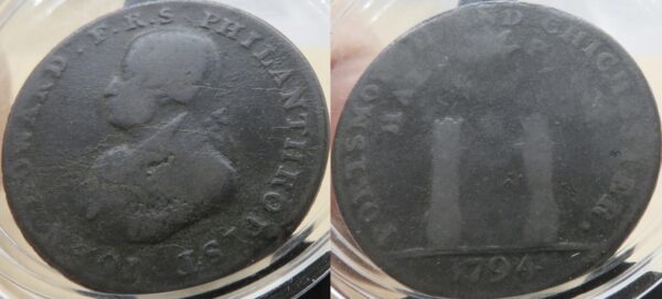 Halfpenny Token (28mm, 10.37 g, 12h). Dated 1794. IOHN HOWARD F R S PHILANTHROPIST, bust of John Howard left / CHICHESTER AND PORTSMOUTH. / HALF-PENNY, three-towered castle with shield above doorway; above, all-seeing eye within sun, set on crescent / Edge: PAYABLE AT SHARPS PORTSMOUTH AND CHALDECOTTS CHICHESTER. D&H 54.