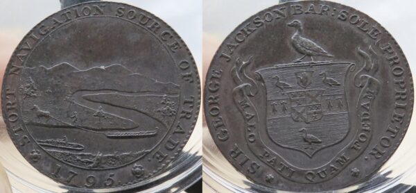 Escudo de armas, timbre com divisa; SIR GEORGE JACKSON BAR: PROPRIETÁRIO ÚNICO / Vista de campo com rio com barcaças; STORT NAVEGAÇÃO FONTE DE COMÉRCIO 1795 ao redor. Borda: A PAGAR EM BISHOPS STORTFORD