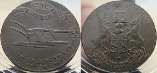 Halfpenny token escasso , 28 mm - British TokensMiddlesex 472a (Scarce). Rupert Street. Copper halfpenny. 9.59 gm. 28 mm. Arms and motto of the Curriers' Company; HALFPENNY above / A plow, GOD SPEED THE PLOUGH on a banner above; PAYABLE IN RUPERT STREET ST. JAMES'S below. Edge: BIRMINGHAM REDRUTH &