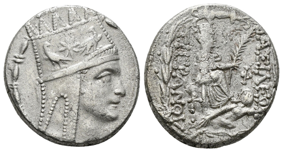 KINGS OF ARMENIA. Tigranes II the Great (95-56 BC). Tetradrachm. Tigranocerta. Obv: Draped bust right, wearing tiara decorated with star between two eagles and tied with diadem. Rev: ΒΑΣΙΛΕΩΣ / ΤΙΓΡΑΝΟΥ. Tyche of Antioch seated right on rock, holding laurel branch; below, river god Orontes swimming right; monogram on rock, all within wreath. 15,61 g
