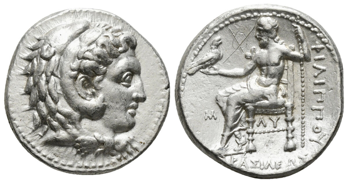 KINGS OF MACEDON. Philip III Arrhidaios (323-317 BC). Tetradrachm. Babylon. Obv: Head of Herakles right, wearing lion skin. Rev: BAΣΙΛΕΩΣ / ΦΙΛΙΠΠΟY. Zeus seated left, holding eagle and sceptre. Controls: M in left field, ΛY below throne. 17,24 g - 26,99 mm