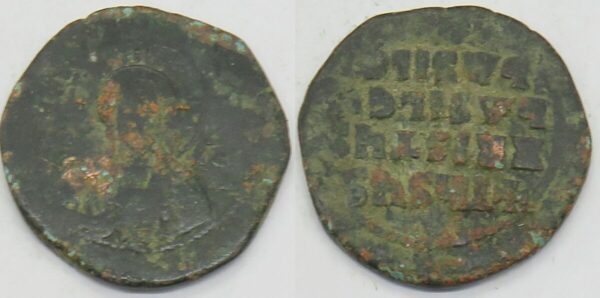 SB 1813 (1) | Basil II and Constantine VIII, AE Class 2 anonymous follis. 976-1028 AD. IC-XC to left and right of bust of Christ, facing, with nimbate cross behind head, holding book of gospels, sometimes with dots in centre of book's border, two dots in each limb of the cross / IhSUS XRISTUS bASILEU bASILE in four lines, ornament below. SB 1813. |