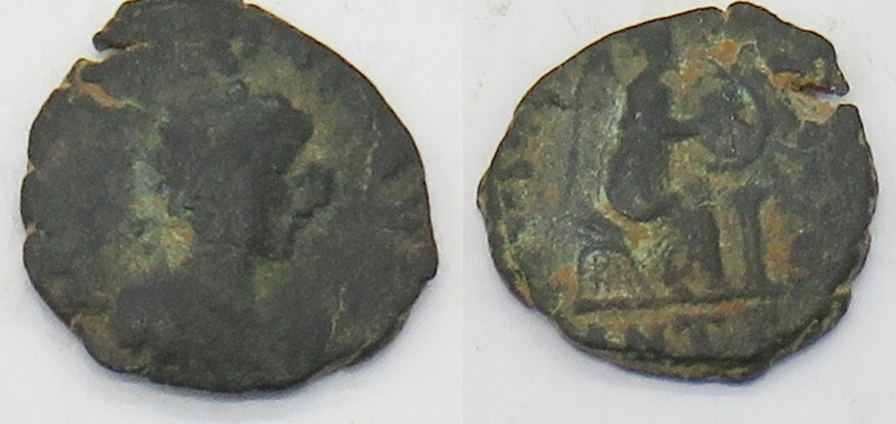 | Antioch RIC 54 | Aelia Flaccilla AE4. AEL FLAC-CILLA, draped bust with elaborate headdress, necklace and mantle / SALVS REI-PVBLICAE, Victory seated right, inscribing a chi-rho on shield set on narrow column. Mintmark: ANTΓ. RIC IX Antioch 54; Sear 20628. |