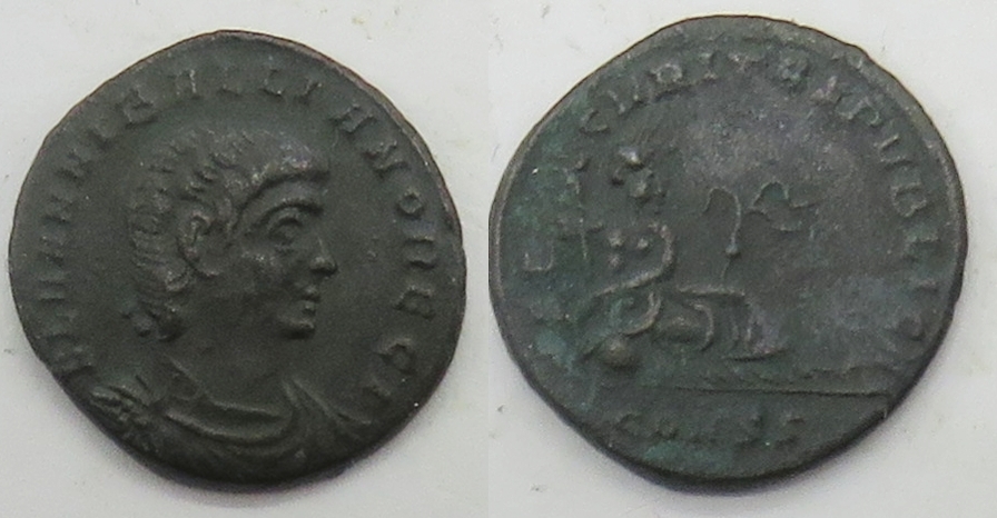 | Constantinople RIC 148, S | Hanniballianus AE4 of Constantinople. AD 336-337. FL HANNIBALLIANVS REGI, bare-headed, draped and cuirassed bust right / SEC-VRITAS PVBLICA, river god Euphrates sitting right, leaning with right arm on sceptre, left hand pouring water from a vase, reed in background. Mintmark CONSS. RIC VII 148; Cohen 2. (Note the break in the reverse legend) |
