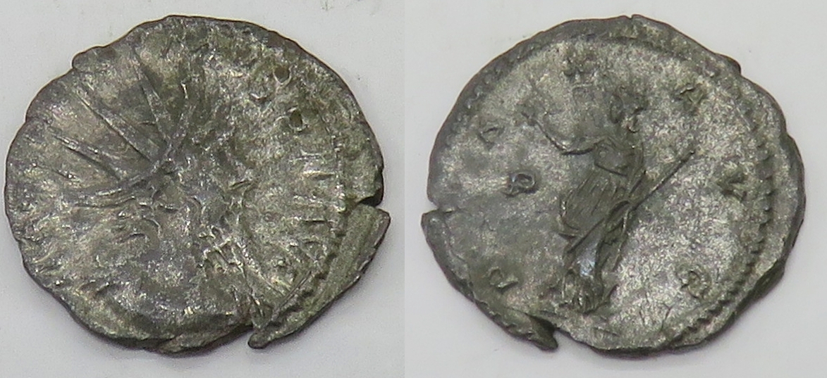 | RIC 318 | Postumus Bi. Antoninianus. Cologne mint, 268 AD. IMP C POSTVMVS P F AVG, radiate, draped and cuirassed bust right / PAX AVG, Pax standing left with branch and sceptre. P in left field. RIC 318, RSC 215, Elmer 333; Sear 10966. Compare with RIC 78 above. |