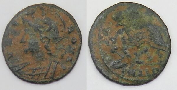 City Commemorative, Antioch, AE follis, 335-337. VRBS ROMA, helmeted head of Roma left, wearing imperial mantle and ornamental necklace / She-wolf suckling Romulus and Remus, helmet and neck piece on wolf's shoulder. Mintmark: SMANΘ. RIC VII Antioch 91 var (shoulder mark). |