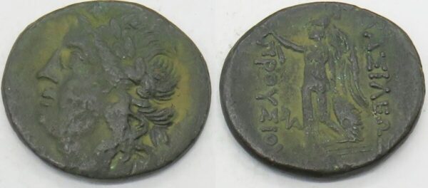 Kingdom of Bithynia, Prusias I Chlorus AE 27mm. Laureate head of Apollo left / BAΣIΛEΩΣ ΠΡOYΣIOY, Athena-Nike standing left, winged and wearing a Corinthian helmet, crowning the king's name with a wreath, resting hand on shield decorated with a Gorgoneion to right, KΡA monogram (K and Ρ retrograde) to inner left. SNG von aulock 6880. RecGen 16, type 4; Sear 7260 DIMENSIONS 26.7mm,10.49g,1h |