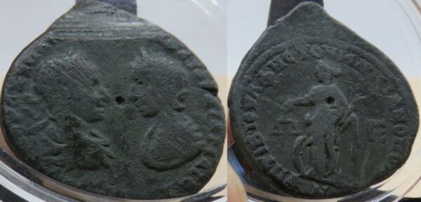 MarkianopolisMoushmov 683Elagabalus and Julia Maesa AE26 of Markianopolis. AVT K M AY ANTNEINOC AY IOYIA MAICA AV, laureate, draped and cuirassed bust of Elagabalus facing diademed and draped bust of Julia Maesa / Y IOY AY CEEYKOY MAKIANOOITN, Nemesis standing left, holding scales and cornucopiae, wheel at foot, E in right field.