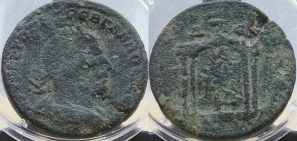 Antioch McAlee 1181 Trebonianus Gallus AE31 of Antioch ad Orontem, Syria. AD 251-253. 24.38 g. AYTOK K OYIB TEB AOC CEB, laureate, draped and cuirassed bust right. / ANTIOXEN MHTO KON, tetrastyle shrine with Tyche seated facing on rock within, river god Orentes swimming at her feet. Ram running right above, D-E across upper fields, SC below. McAlee 1181.30,18mm,18,64gms