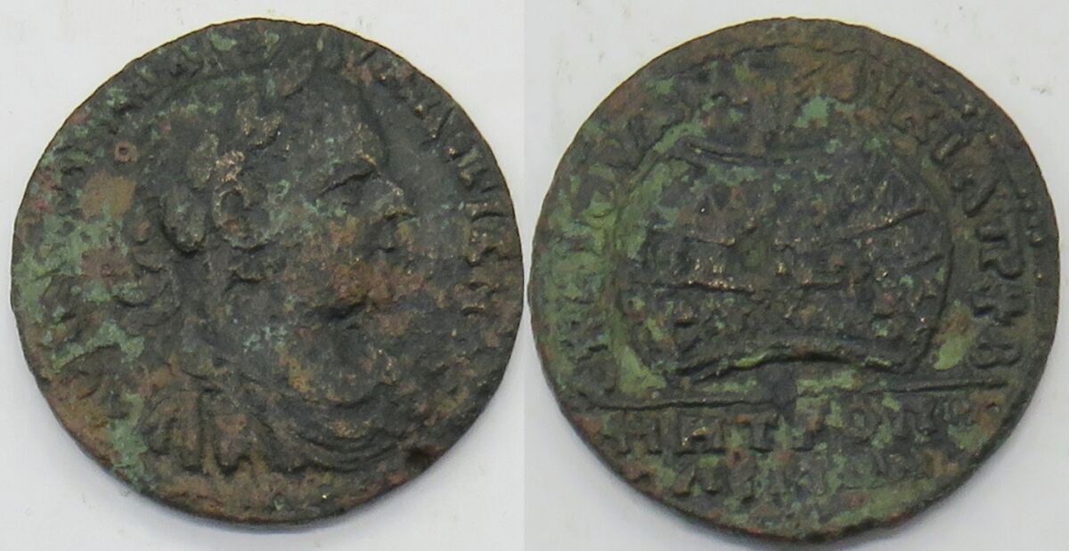 | Metropolis Ionia SNG Tubingen 2985 | Valerian AE26 of Metropolis, Ionia, AD 253-260. 6.65 g. Magistrate Val. Nikias. AYT K ΠOΠ ΛIKI OYAΛEΡIANOC, laureate, draped and cuirassed bust right, uncertain circular countermark on cheek / EΠ CTΡ OYA NEIKIA ΠΡ TO B MHTΡOΠOΛEITΩN (TΡ, ΠΡ and TO ligate) around and beneath prize crown inscribed CE KAICAΡEA, containing two palm branches. SNG Tuebingen 2985. |