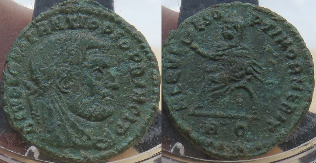 Nummus. Commemorative issue, struck under Constantine I in Rome, AD 317-318. DIVO CONSTANTIO PIO PRINCIP, laureate and veiled head right / REQVIES OPTIMORVM MERIT, Divus Constantius seated left on curule chair, raising hand and holding sceptre; RQ in exergue. RIC 105.