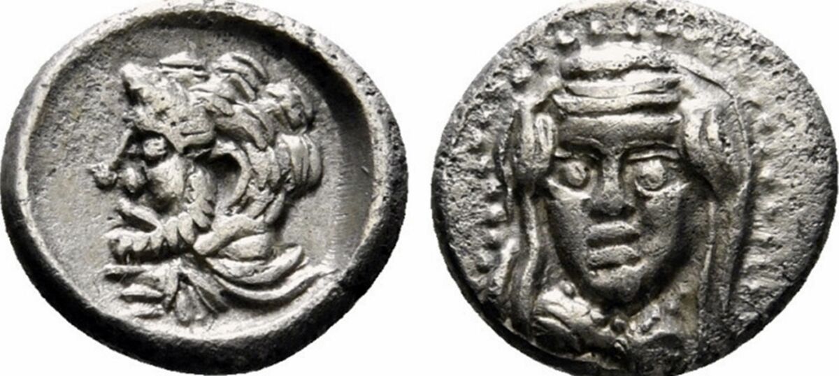 CILICIA. Uncertain. Obol (4th century BC). Obv: Head of Herakles left, with lion skin draped around neck. Rev: Veiled and draped bust of female facing slightly left.0,43 g