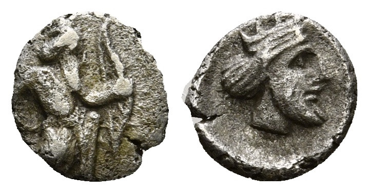 PERSIA, Achaemenid Empire. temp. Artaxerxes II to Darios III. Circa 400-332 BC. AR Tetartemorion. Kolophon(?) mint. Persian king or hero, wearing kidaris and kandys, quiver over shoulder, in kneeling-running stance right, holding spear and bow / Crowned head of Great King right. 0,13 g