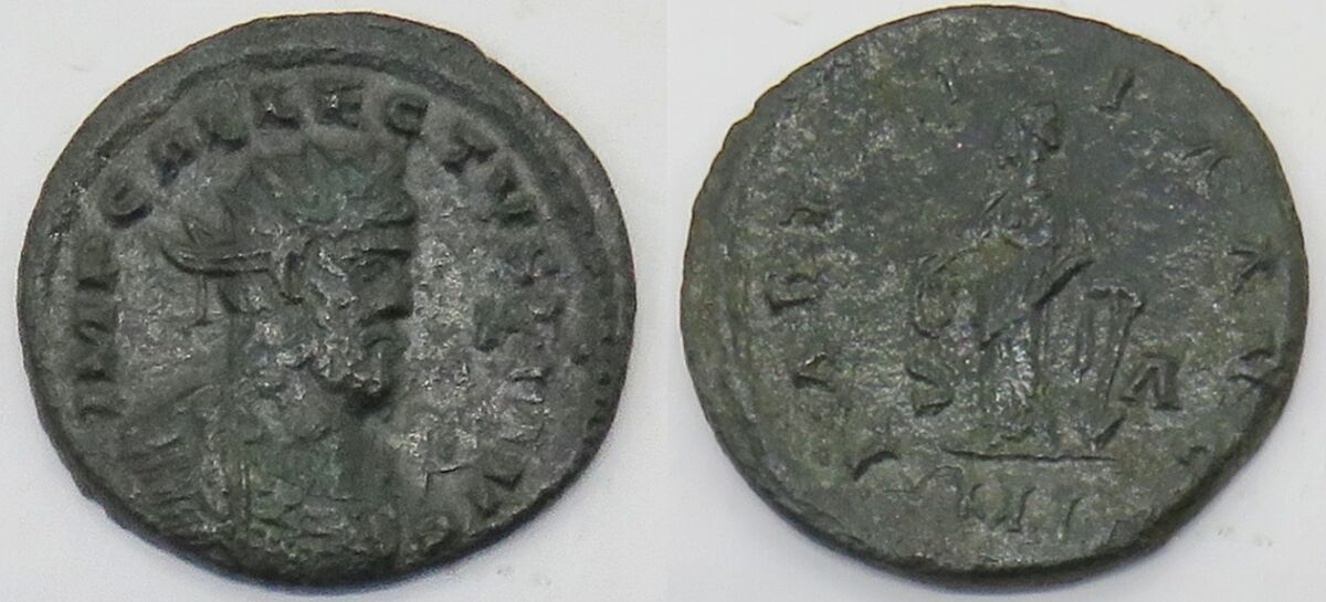 | RIC 22 | Allectus AE Reduced Antoninianus. London Mint. IMP C ALLECTVS PF AVG, radiate and cuirassed, or radiate and draped, or radiate, draped and cuirassed bust right / LAETITIA AVG, Laetitia standing holding wreath and anchor, S-A across fields. Mintmark MSL or ML. RIC 22; Sear 13811. |