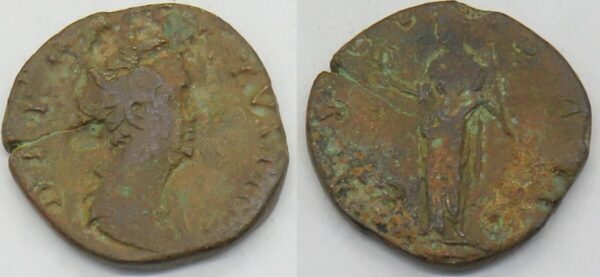 RIC 1124 | Faustina, AE sestertius, posthumous, after 141 AD. DIVA FAVSTINA, draped bust right / AVGVSTA, S-C, Vesta, veiled, standing facing, head left, holding Palladium and sceptre. RIC 1124. |