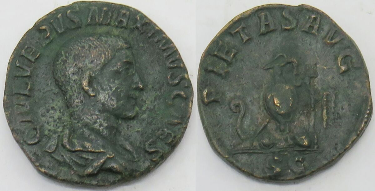 | RIC 6 Sear 8408 | Maximus, Caesar AE Sestertius. C IVL VERVS MAXIMVS CAES, bare-headed, draped bust right / PIETAS AVG, sacrificial implements, SC in ex. RIC 6, Cohen 5. |