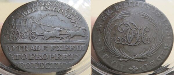 TRADE TOKENS, Middlesex. Treinador de correio. Token de meio centavo (27mm, 8,55 g, 12h). Atingido em 1797. C